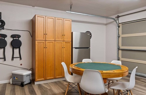 -Heated Game room with air hockey, poker table, poker chips, bumper pool, and a dart board