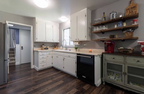 Enjoy a morning cup of coffee or hot chocolate made fresh in your keurig. Followed by a nice meal in your fully equipped retro style kitchen. Enjoy all the extras, with microwave, oven, & stove, a rice cooker, crock pot, air fryer, seasonings & more! Farm style Dining table seats 6.