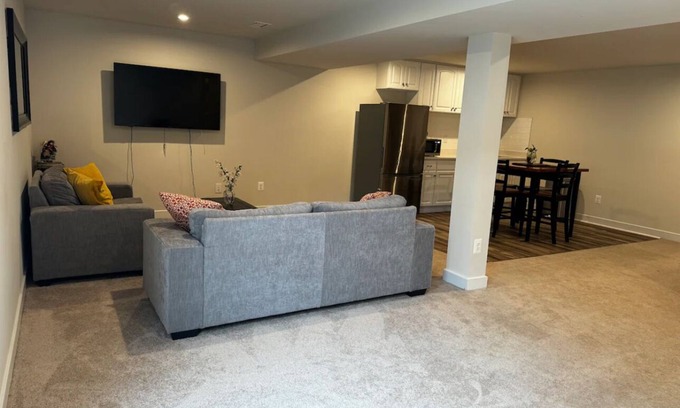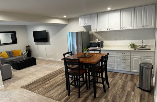 -Spacious brand-new finished basement with one room, a full private bath, and a kitchenette with fridge, microwave, and coffeemaker.