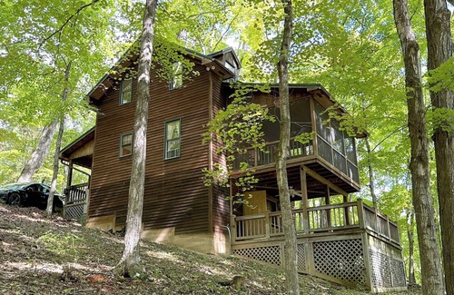 Enjoy a relaxing weekend in this mountainside retreat. The home is perched on a hillside, with a large screened porch that sits among the treetops.