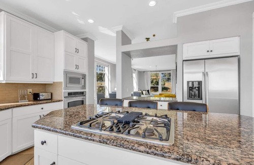 It is fully equipped with stainless steel cooking appliances that make it suitable for preparing any meal, whether a simple breakfast, a quick snack, or a three-course gourmet dinner. Spacious granite countertops and the central kitchen island provide plenty of room to work your MasterChef magic.