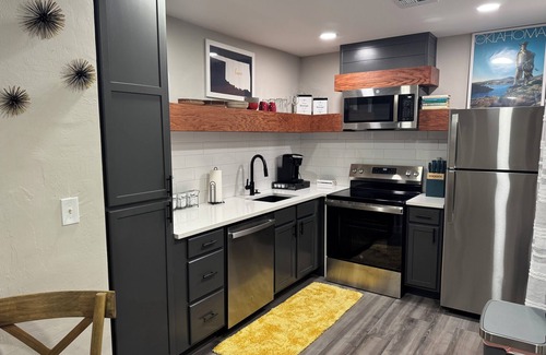 This 1-bedroom condo is perfect for your escape to Oklahoma City. Fully remodeled condominium in a gated community with pool! Located in the heart of NW OKC shopping and Medical Center areas. Perfect for business travelers and those needing a nice place to stay while visiting OKC. Ring doorbell and gated community for security. The TVs have Roku so guest can use their own streaming services (Amazon prime, Netflix, Hulu, Apple TV, etc.) The brilliant bedroom features a cozy queen bed, ideal for a soothing night's sleep. With amenities like heating, a washing machine, WiFi, and AC, guests can relax and unwind effortlessly. The charming bathroom offers a refreshing shower to start your day right. We hope you enjoy our place and everything Oklahoma City has to offer.
