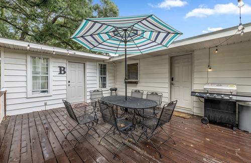 Stay close to it all at this centrally-located haven, perfect for family and friends! Close to the interstate in a safe and quiet neighborhood. This house includes 4 bedrooms, 3 full bathrooms (3/2 in Unit A and 1/1 in Unit B) and sleeps up to 20! There is also an amazing bonus room with a projector TV (up to 120 inches), ping pong table, and more! Relax on the back deck and marvel at the expansive, beautiful backyard with a gorgeous live oak and plenty of grass!