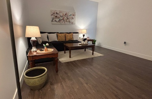 New Home with Cozy Bedroom & big Recreational room with Netflix . Garden Facing in a nice .. Clean full washroom with bathtub. Close to highways & bus stop for convenient travelling Parking included . Ideal for family vacation
