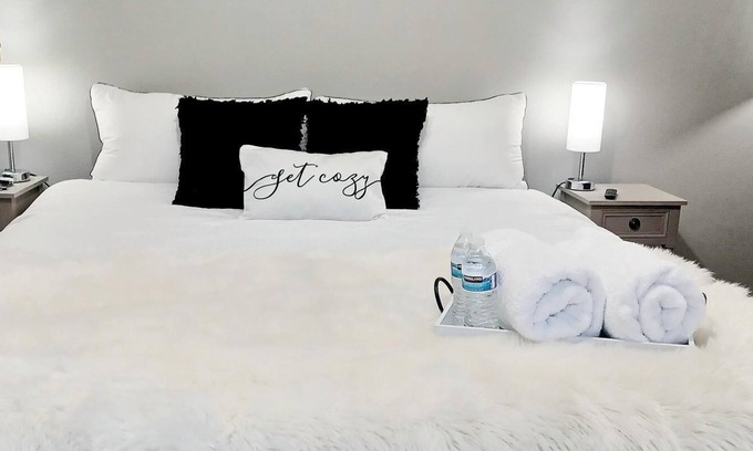 Get Cozy in your California King Bed w/Blackout Curtains, Dressers, Full Length Mirrors, Walk in Closet, Touch Light Side Table Lamps w/USB Ports and Plugs for the Convenience of Charging your Smart Devices. 55” Flat Screen TV, DVD Player and Firestick for Streaming Free Movie Apps or Log into your Amazon, Netflix, etc.