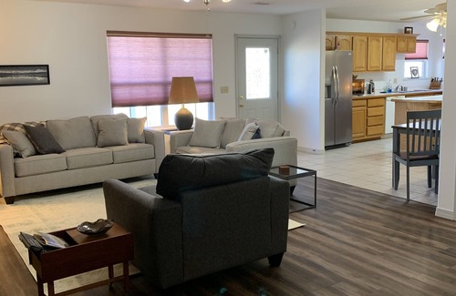 Relax in a full size home in a country setting, yet 20 minutes to an hour drive from major tourist spots. There are 2 queen size beds in one room and a king size in the other room. There is also a couch that opens up to a queen size bed.The king size bedroom has an ensuite. You will feel at home in a full size living room open to a large kitchen. A two car garage is attached. We're on 20 acres with the woods as a backyard. Deer and turkeys roam freely. Grill out or sit around the fire pit under the pergola.
