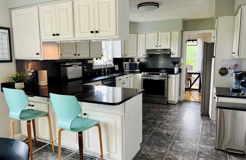 The finished basement adds extra space with a pull-out queen-sized couch and a convenient kitchenette, complete with a mini fridge, microwave, coffee maker, and other accessories that will make guests staying in this area more comfortable. Whether you're here for a short stay or an extended visit, our home offers all the comforts and amenities to make your stay memorable.