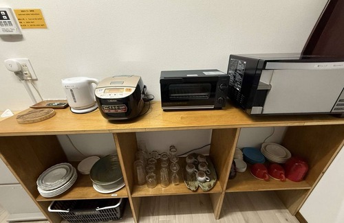 Refrigerator, Microwave, Gas stove (3 burners), Rice cooker, Electric kettle, Oven toaster, Plates, Cups, Glasses, Rice bowls, Cutlery, Kitchen knives, Cutting board, Pots, Frying pan, Lighter