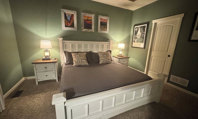 Beautiful smart home ranch style with all of the amenities, heat, AC, backyard fountain, comfortable patio seating for 10, 3 separate private bedrooms. Master king suite with rain shower, jack and jill sinks, deep bath tub. 2nd bedroom with 40” Wall TV and queen bed. Front 3rd bedroom with twin bed and additional pullout twin bed. Comfortable open concept living room with 70” screen. Home sleeps 8 comfortably (2 guests per bedroom). Board games available, various TV streaming options included.