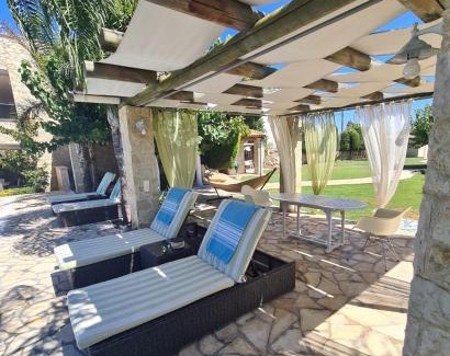 Offering a garden, Entire Villa with private pool offers accommodations in Skála. This property offers access to a balcony, free private parking, and free Wifi. Guests can use barbecue facilities. Providing a terrace and sea views, the spacious villa includes 4 bedrooms, 2 living rooms, cable flat-screen TV, an equipped kitchen, and 4 bathrooms with a shower. Guests can take in the views of the mountain from the patio, which also has outdoor furniture. There's also a seating area and a fireplace. In addition to a seasonal outdoor pool, the villa also provides kids pool. Agios Konstantinos Port is 16 miles from Entire Villa with private pool. Nea Anchialos National Airport is 94 miles away.