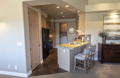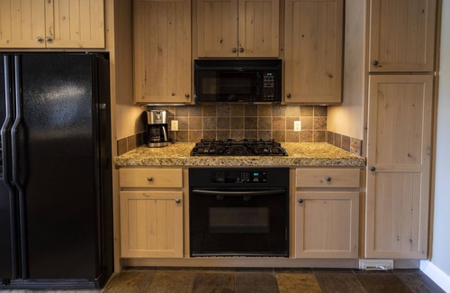 Large kitchen features granite countertops and slate tile. Kitchen is stocked with coffee maker, toaster, utensils, dishes, many small appliances, and other items you may need during your stay. The unit also includes a separate laundry space with a washer, dryer, iron and ironing board. It also has an attached double-car garage.