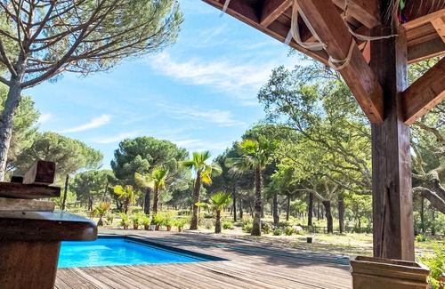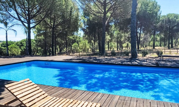 Large, luxurious "rustico" cottage "Entre as Árvores". 102 houses in the resort. 14 km from the centre of Alcácer do Sal, 14 km from the centre of Comporta, in a secluded, quiet position, 16 km from the sea, 16 km from the beach, 1.6 km from the river, in the countryside, in the woods. For shared use: property 997 ha (fenced). Tennis (2 x hard court) (extra), basketball (extra), children's playground. Private: property (fenced), swimming pool angular (6 x 12 m, seasonal availability: 01.Jan. - 31.Dec.). Outdoor shower. In the complex: reception, restaurant, WiFi, air conditioning, washing machine. Parking on the premises. Supermarket 2 km, restaurant 2 km, bus stop 15.1 km, sandy beach "Praia da Comporta" 16 km, lake Herdade de Montalvo 50 m. Marina 31 km, golf course (18 hole) 30 km, tennis, riding stable, walking paths from the house 50 m. Nearby attractions: Comporta 16.2 km, Praia fluvial, da comporta 9.3 km, Estação Arqueológica de Abul 35.8 km, Tróia 30.1 km, Alcácer do Sal 14.4 km, Viveiro Florestal da Mata Nacional 16.8 km. Please note: car recommended. Suitable for families. 24hr guard.