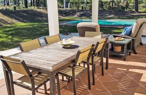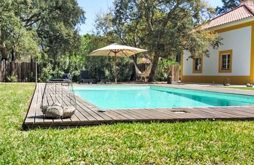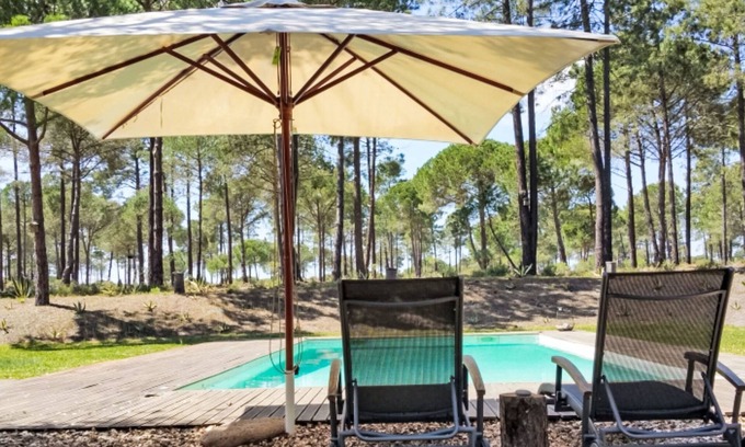 Large, luxurious "rustico" cottage "Entre os Pinheiros". 102 houses in the resort. 14 km from the centre of Alcácer do Sal, 14 km from the centre of Comporta, in a secluded, quiet position, 16 km from the sea, 16 km from the beach, 1.6 km from the river, in the countryside, in the woods. For shared use: property 997 ha (fenced). Tennis (2 x hard court) (extra), basketball (extra), children's playground. Private: property (fenced), swimming pool angular (5 x 10 m, depth 110 - 190 cm, seasonal availability: 01.Jan. - 31.Dec.). Outdoor shower. In the complex: reception, restaurant, WiFi, washing machine. Parking on the premises. Supermarket 2 km, restaurant 2 km, bus stop 15.1 km, sandy beach "Praia da Comporta" 16 km, lake Herdade de Montalvo 50 m. Marina 31 km, golf course (18 hole) 30 km, tennis, riding stable, walking paths from the house 50 m. Nearby attractions: Comporta 16.2 km, Praia fluvial, da comporta 9.3 km, Estação Arqueológica de Abul 35.8 km, Tróia 30.1 km, Alcácer do Sal 14.4 km, Viveiro Florestal da Mata Nacional 16.8 km. Please note: car recommended. Suitable for families. 24hr guard.