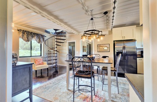 The carport (you can get two cars end to end in the carport/driveway - if you need more parking just let us know) is just below the cantilever of the shipping containers. There is a door right off the carport that leads into the Laundry room/kitchen area. The front entry patio has a small seating area. The pass code lock is on the front door. We have Wifi throughout the house!