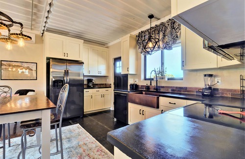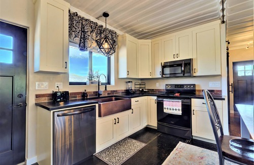 The kitchen is stocked as well as any kitchen should be with all new and modern appliances. Equipped with all the things you need to cook a homemade meal or just be able to warm something up. We have black stainless steel appliances include a electric oven, french door refrigerator with ice and filtered water in the door, built in microwave and range hood, dishwasher, large copper farmsink with garbage disposal, toaster, coffee maker, coffee, creamer, sugar, spices, waffle maker, griddle, slow cooker crockpot, blender, pots, pans, glassware, bakeware, and prepware. The table is set up to set 4. We also have comfortable folding chairs that can be added as well for more seating. Also, there is a nice size patio right off the kitchen - great for breakfast! We've tried to think of everything you might need during your stay at Envase Casa.