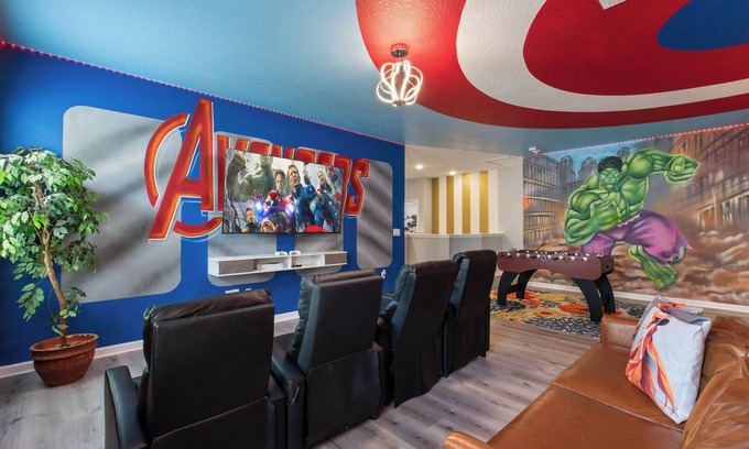 Enjoy a movie night in the Avengers-themed theater, challenge each other in the game room, or take a dip in your private screened-in pool after a day at the parks.