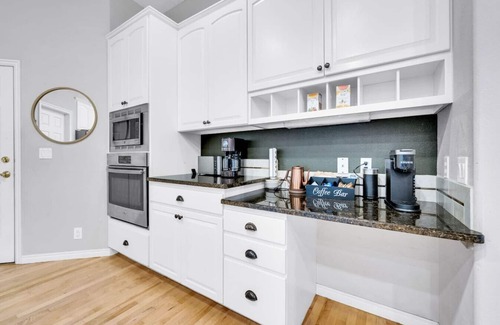 Chef’s kitchen comes with kitchen essentials you need to cook wonderful meals and a coffee bar with Keurig that has an imbedded espresso maker, milk frother for latte’s and cappuccinos, French press, pour over, and drip options available to suit your preferences. There is a built in gas stove on the island in addition to standard appliances.