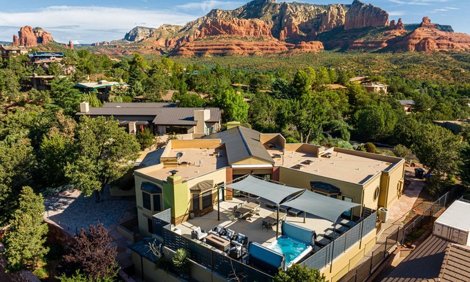 What Makes Sedona HyViews Amazing Red Rock View- Patio+Hot Tub Large Groups-Enjoy Bar & Games! Perfect for Weddings