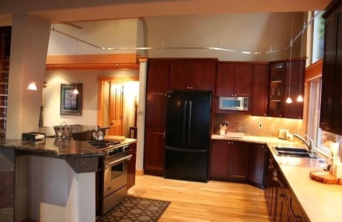 The full kitchen at Koru Lodge faces views to the front of the home, a dining table which seats 8 and a granite island which faces the great room and the pool table. There are two bedrooms upstairs on the main living floor with one bathroom. One bedroom has a California King bed with a private deck which faces West to the National Forest and has a LCD TV. The second bedroom has a queen size bed with a LCD TV. The loft is off the main floor living where you will be able to view the stars as you fall into a deep slumber in your cozy queen size bed. The bathroom on the main living area is next to the master bedroom and has a two person slate shower and a double sink. The second bathroom is downstairs down the hall from the inviting 3rd bedroom. This bedroom has a queen size bed with a LCD TV. The bathroom downstairs has access to the laundry room, lower deck and to the back yard. This bathroom has a shower/bathtub combo and a double sink.