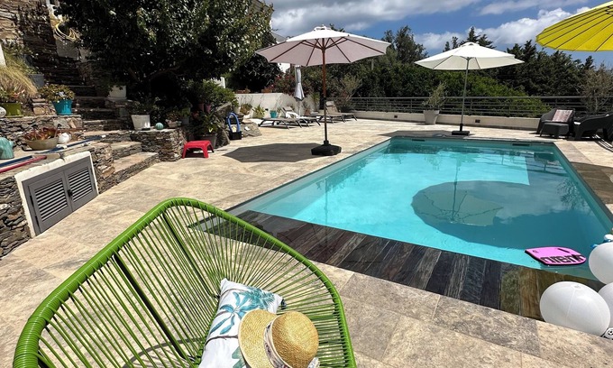 Access to the swimming pool with dimensions of 8 m x 4 m, deckchairs and terrace.