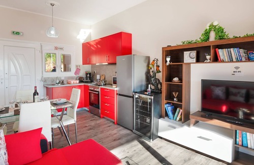 Eros Apt is spacious for a family with one or two small children who can be accommodated in one air-conditioned bedroom and on the living room sofa. This charming house is a twin with the next door Kati Sea View Apt and can be rented together for a larger family or group.
