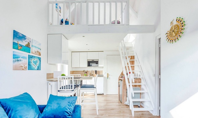Cocon de 32 m2 est situé à 3 min à pied de la gare de Corbeil-Essonnes. Il peut accueillir jusqu'à 5 personnes. Cet endroit est confortable et entièrement équipé : connexion Wi-Fi, jeux de société, PS4, parking gratuit . Il comprend une chambre avec un grand lit double pour deux personnes et un lit pour bébé, une mezzanine avec 1 lit pour 2 personnes, un salon avec un canapé-lit pour 2 personnes, une cuisine, ainsi qu'une salle de bain avec des toilettes.
