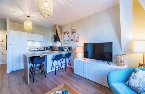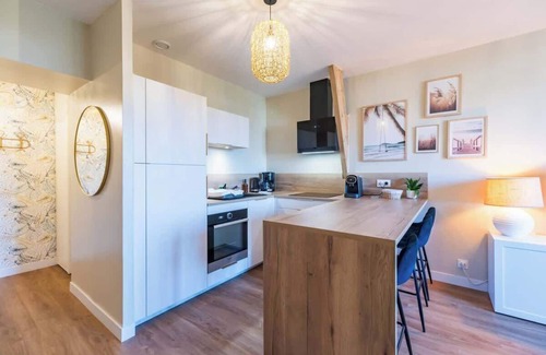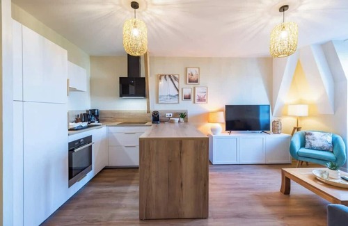 L’appartement se compose d’une entrée avec un grand placard de rangement. La cuisine aménagée et équipée presque comme à la maison (frigo avec congélateur, plaques à induction, four, micro-ondes, cafetières filtre et L’Or, bouilloire, grille-pain) est ouverte sur une pièce de vie lumineuse et conviviale, avec un grand écran TV, un canapé-lit (140x200) et un surmatelas Emma pour un couchage optimal.