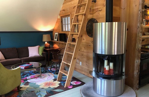 Fun, roomy design with a Maine woods spirit. Sleeps 5. 2 bedrooms, one on first floor and one in the loft. Sofa Sleeper in common area. Porch and Deck. Very cool woodstove. Fire pit in the meadow and a cozy hammock hidden between a couple of spruce trees. While good neighbors are close by, they are not visible; we are bordered by woods on all sides.