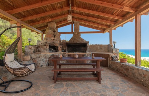Villa “Escape in Blue” is located in the bay of Stalis in Municipality of Hersonissos, Crete. It is a luxury 2-bedroom villa which is about 380 meters or 7 minutes on foot, from the beach of Stalis. The villa is located in a 4000 square meter plot, which offers privacy and calmness. A beautiful natural environment surrounded with magnificent flora (mediterranean plants and grey-blue stones). The 2 bedrooms and bed-sofa can accommodate 4 guests and an extra guest, respectively. The villa is furnished with high quality hardwood furniture and offers a fully equipped kitchen with the essential electrical and cooking appliances. The bathroom allots a laundry machine. In addition, the villa has a spacious parking area, a stone barbeque and a large wooden dining table with 12 seats. You can, also, dine at the stone-terrace while enjoying the abundant sea and mountain view. BONUS: Please note that for more than 10 days of booking we do offer a free boat trip, only for adults, to the nearest bays and a free unique meal at the barbeque.