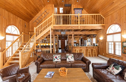 The rural estate is perfect for winter sport enthusiast, summer adventurers, and autumn lovers. The open concept main level features a large kitchen and dining area for group eating. The spacious common area offers comfy couches, a big fireplace to warm up to, TV for entertainment, and huge windows with plenty of natural light. The whole house has wood panel walls and decorations to give a mountain cabin ambiance.