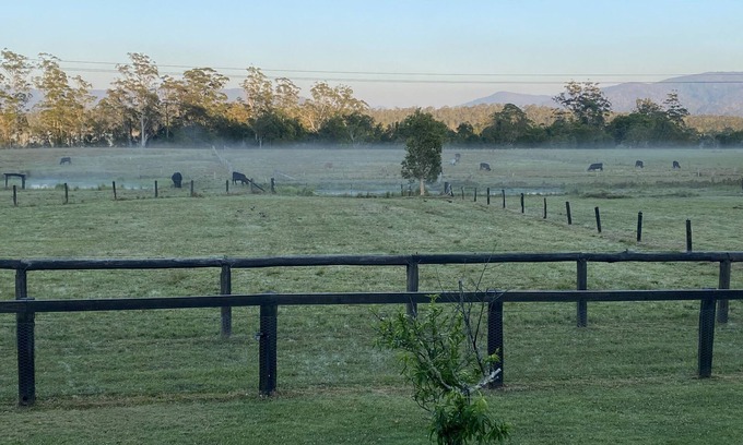 Escape from everyday life on 50 acres of beautiful grazing paddocks bounded by the buladelah river and distant mountain ranges. Four magnificently appointed bedrooms allowing for accommodation of up to 10 people. The main bedroom has a ensuite with and luxurious bath overlooking the cows. There is a second room with a queen bed, beautifully appointed. There is a room with four bunk beds and a fourth bedroom with a double bed. The house has a well equipped kitchen with an adjoining lounge with a magnificent fire place, tv and comfortable seating for all guests.