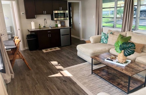 The guest house has one bedroom with a queen bed, a kitchenette with a mini fridge, sink, and microwave, a large sitting area with a sectional sofa and Roku equipped TV, a wall mounted collapsible table/desk, and a bathroom. The sectional sofa can be a great additional sleeping space and is large enough to comfortably sleep two adults. Additional blankets and sheets provided.