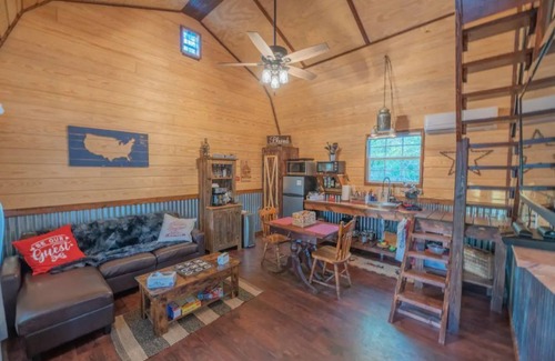 Take it easy at this unique and tranquil getaway. We have all the amenities you will need for a great stay away from the hustle and bustle of your everyday life. A stylish little cabin in the country with access to walking trails, a pool, and a hot tub($) at the main house, which is a short walk up the hill. We have farm animals, and we run an animal rescue that can have anywhere from 14 to 32 dogs. They stay in a fenced-in yard where the pool is located. They love to swim with guests!