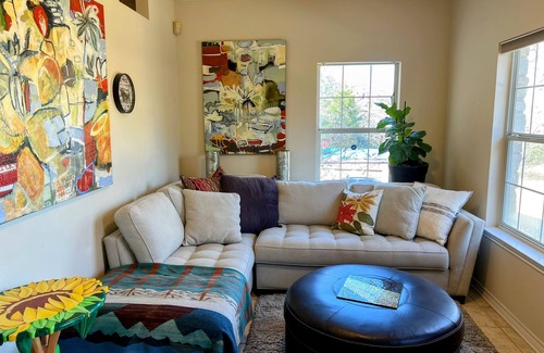 Spend your day relaxing in nature with birds and deer yet minutes from downtown Bastrop, music, restaurants and Austin. This property is a registered wildlife preserve and habitat. The pond has fish and ducks in it, and we invite you to fish, but on a catch and release basis. Outdoor covered patio with fireplace and TV invites communal fun. Large kitchen, 2 living areas, 2 upstairs bedrooms, 1.5 baths and sun room, give you plenty of space to spread out. Summertime includes a pool overlooking the pond and trees! A 2 person hot tub overlooking the pond is a wonderful way to start or end the day. Be our guests! You won't regret it!