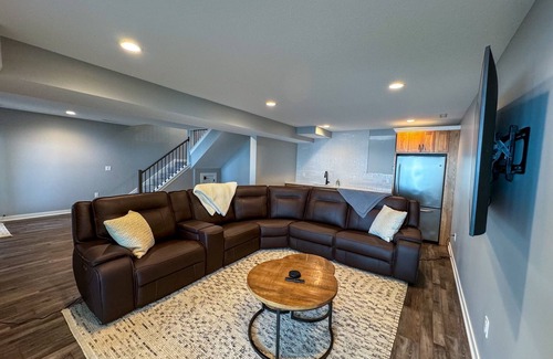 This newly renovated cabin features 6 bedrooms, 4 bathrooms, and a gas fireplace. Elevate your culinary experience in our rental cabin's gourmet kitchen, fully equipped with top-of-line appliances and spacious countertops, perfect for creating delicious meals while enjoying the serene lake view. There are two large comfy common areas with spacious seating to rest and recharge. Enjoy a movie on one of the large flatscreen TV's or play games with family and friends.