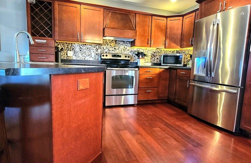 Full kitchen with stove, dishwasher, fridge, microwave, coffeemakers, griddle, toaster, crock pot, popcorn maker, pots/pans and dishes/utensils