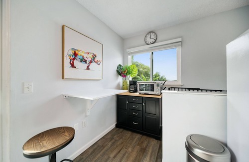 The custom kitchenette is a culinary haven, boasting granite countertops, under cabinet lighting, and the convenience of a two-burner induction cooktop that offers precise and effortless control. Abundant storage, including pull-out drawers in all lower cabinets and a fantastic pantry, ensures you have everything you need right at your fingertips. Washer and dryer units, along with a generously sized refrigerator, add to the convenience and comfort of your stay.