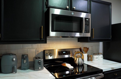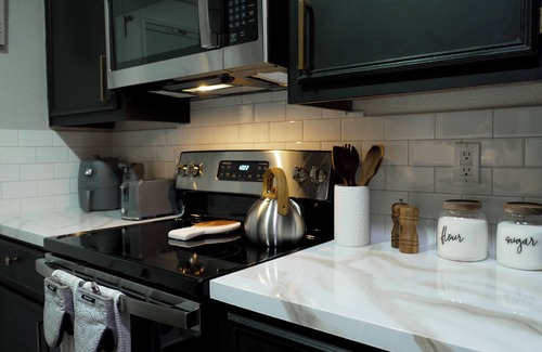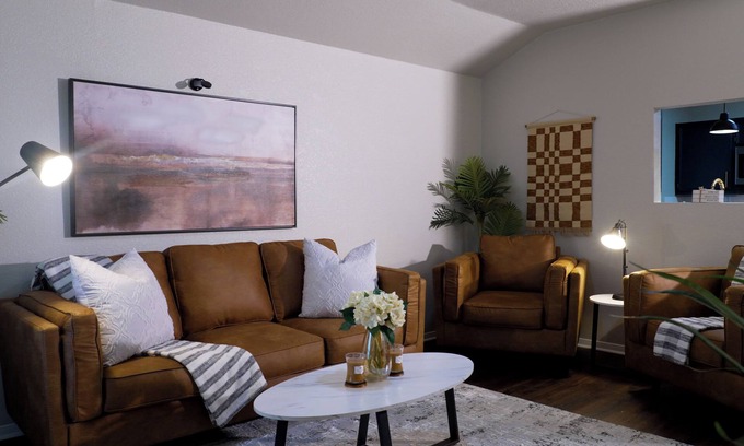 This cozy, one-story house features a modern rustic concept living room dining room, a fully stocked kitchen, and laundry room. The kitchen includes full-sized appliances. You will find three bedrooms, the master bedroom has a queen bed, the second bedroom has a queen bedroom, and the third bedroom has two twin-sized beds. The master bathroom has a garden tub rain shower with a rain shower handle system, double vanity, and make-up vanity station, the hallway bathroom includes a standing shower. Both bathrooms include soap, and fresh linens.