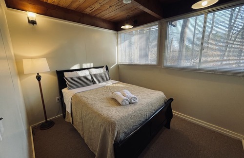 Escape to our cozy cottages nestled in Tanglewood Park's peaceful woods. Cottage #1 features 2 cozy bedrooms, 1 bathroom, a generous living room. Relax with stunning lake views and a variety of activities. Go fishing, boating, or swim in our seasonal pool. Enjoy golf or Softgolf, horseback rides, and BMX Racing. Don't forget your furry companion; we're pet-friendly! Let them roam freely at Tanglewoof, our dedicated dog park. Unwind in nature's beauty and make unforgettable memories.