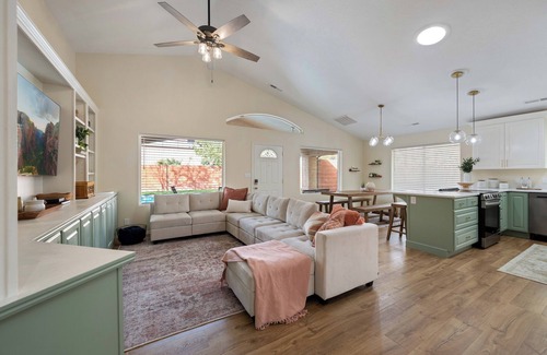 Welcome to Red Rock Hideout, a newly renovated 3-bedroom, 2-bath home near St. George, Utah! Enjoy a private pool with waterslides, hot tub, putting green, corn hole, and a basketball/pickleball court. The game room offers foosball, arcade, and video games. It comfortably sleeps 9, with space for 11, and includes 2 pack and plays for infants. Close to Zion, scenic hikes, and amazing local restaurants. It’s the perfect Southern Utah retreat for your family and friends!