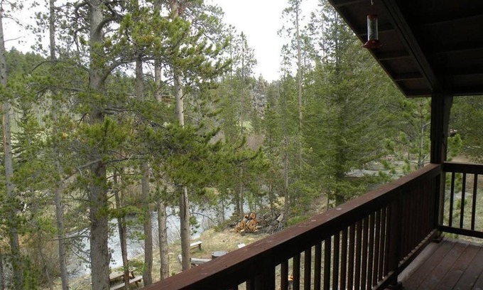 *Wood stove, microwave, covered deck overlooking the North Fork of the Cache la Poudre River with patio set, picnic table with seating benches by the river.