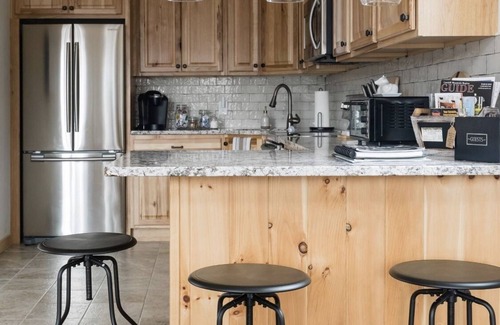 Get cozy by the fireplace in this contemporary chalet with mountain views. Relish in the lofty, exposed wood ceilings, bamboo flooring, and chef’s kitchen. The paired-down Scandinavian-style decor and varied textiles create an inviting atmosphere.
