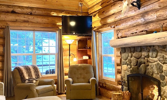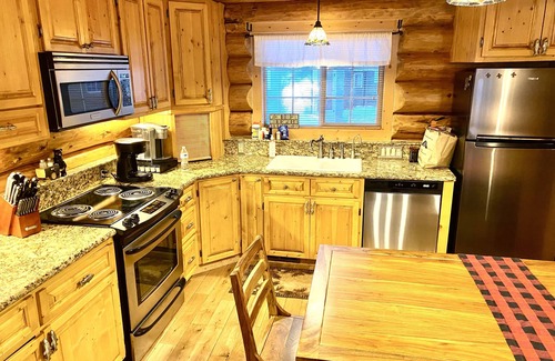 Comfortably sleeps 8, including 3 bedrooms and a small couples cabin in the back yard. Both upstairs bedrooms have snug queens as well as an open loft with overstuffed chairs (perfect for your morning coffee and a good book!). On the main floor is the king bedroom, a large living area, a floor to ceiling stone fireplace that warms the home, as well as a beautiful and inviting kitchen with granite counter tops. A full bathroom with a washer and dryer