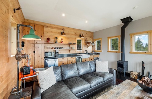 Living Area: The living area has a large couch, coffee table, board games, puzzles, Smart TV, Bluetooth speaker, wood-burning stove (wood and starters included) and wall heater.