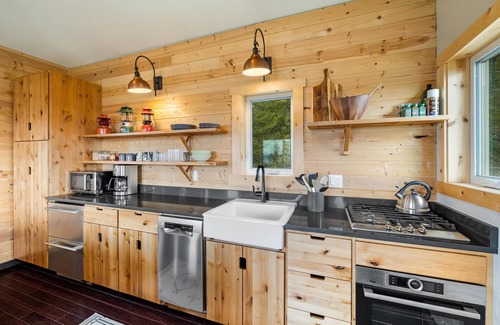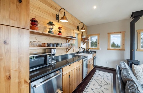 Kitchen: T full-size kitchen is complete with a mid-size fridge, oven with range, farmhouse sink, microwave, and coffee maker. Also included are dishes, utensils, pots, pans, and kitchen amenities.