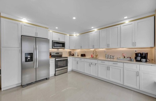 The fully equipped kitchen boasts ample cabinetry, spacious countertops, and state-of-the-art appliances. Prepare gourmet meals with ease, then gather around the dining table for memorable feasts.