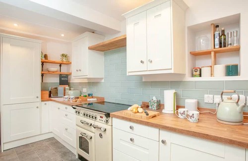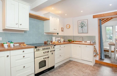 In the living room, enjoy a wood burner with supplied logs and kindling, a large flat-screen TV with Freeview and streaming access, and a selection of board games and puzzles. The corner sofa converts into a sofa bed for extra guests—please let us know if you need additional bedding. French doors lead directly to the garden, where you’ll find outdoor seating for up to eight and a separate bistro table for morning coffee.