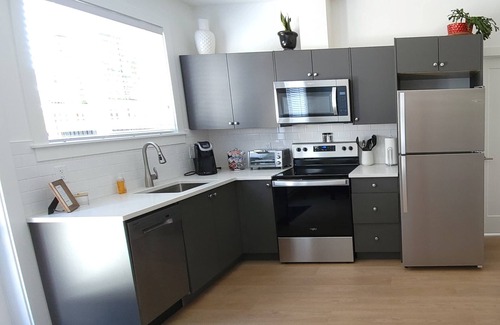 Perfect for 2–4 guests, the suite features two newly constructed bedrooms with queen-sized beds. The kitchen boasts quartz countertops and is fully equipped with a Keurig, convection oven/toaster, microwave, full-sized fridge, and all cookware needed to create a delicious meal.