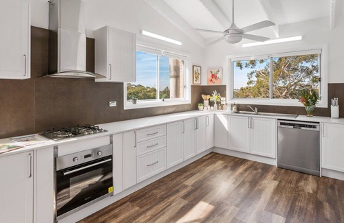 Most rooms of the house have views. The main bedroom (queen bed) with ensuite and walk in wardrobe. 2nd and 3rd bedrooms (double beds) are a good size and super comfy both with built in wardrobes. The large main bathroom has a spabath. There is also a sofa bed in the loungeroom if needed.