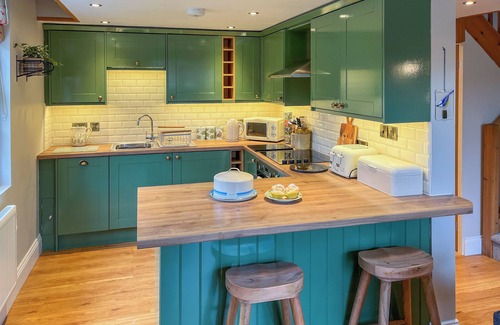 The beautifully designed open plan living space on the ground floor creates a warm and welcoming atmosphere, featuring a fully equipped kitchen with a breakfast bar, a dining area, and a cosy seating space with a wood-burning stove and Smart TV—perfect for unwinding after a day of exploring. Patio doors open onto a lovely garden with outdoor furniture and a barbecue, ideal for enjoying meals in the fresh country air. The cottage boasts two comfortable bedrooms, both with en-suite facilities. One is conveniently located on the ground floor, while the other is on the first floor. A charming mezzanine level provides the perfect space for children to play or relax with a book. Thoughtfully designed for comfort and style, this cottage makes for a truly memorable stay. The owners also provide a hairdryer.
